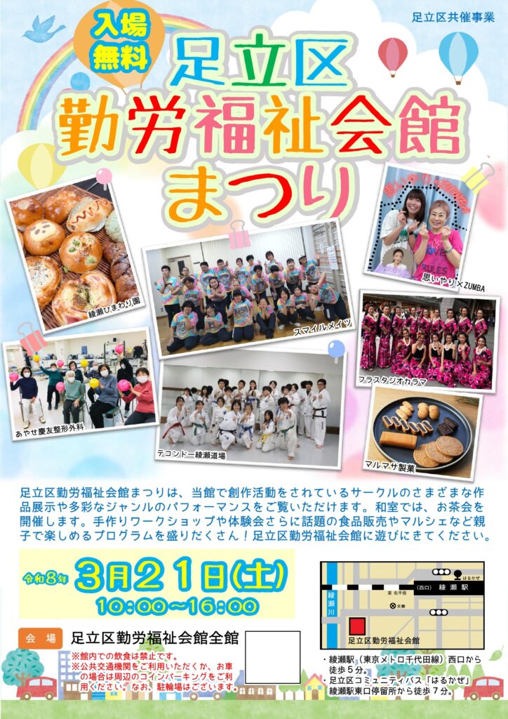 令和8年3月21日に足立区勤労福祉会館にて「足立区勤労福祉会館まつり」を開催いたします。
