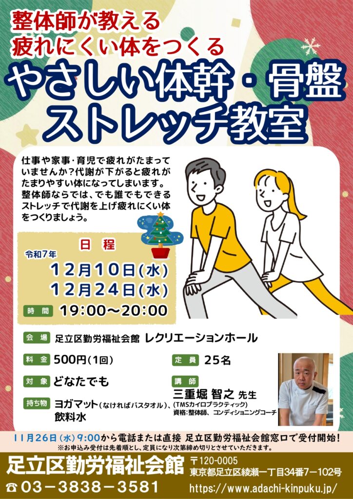 12月は下記日程で「整体師が教える 疲れにくい体をつくるやさしい体幹・骨盤ストレッチ」を開催いたします。