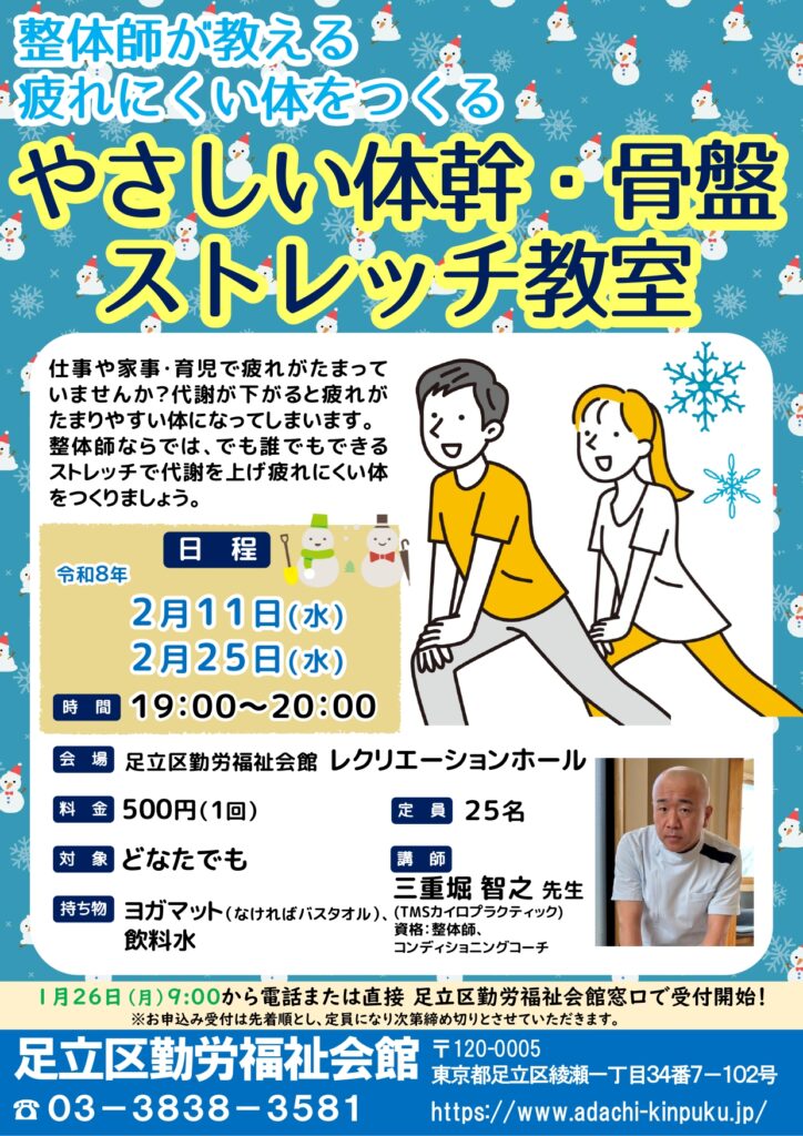 「整体師が教える 疲れにくい体をつくるやさしい体幹・骨盤ストレッチ教室」2月開催のお知らせ